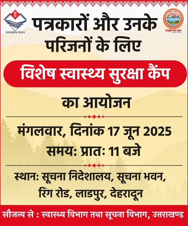 देहरादून। उत्तराखण्ड में पत्रकारों और उनके परिजनों के स्वास्थ्य की चिंता को लेकर राज्य सरकार बेहद गम्भीर है। मुख्यमंत्री पुष्कर सिंह धामी के निर्देश पर, मंगलवार 17 जून को सूचना निदेशालय, रिंग रोड, देहरादून में एक विशेष नि:शुल्क स्वास्थ्य सुरक्षा कैम्प का आयोजन किया जा रहा है।यह कैम्प स्वास्थ्य विभाग व सूचना विभाग के संयुक्त प्रयास से प्रातः 11 बजे से शुरू होगा।