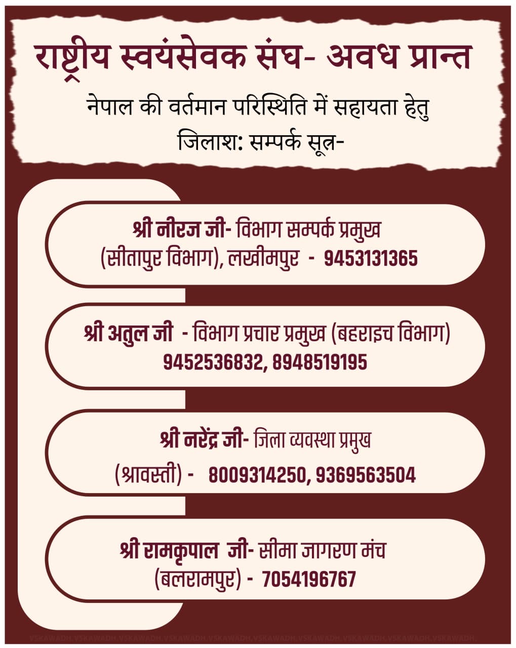 नेपाल की वर्तमान परिस्थितियों को देखते हुए राष्ट्रीय स्वयंसेवक संघ- अवध प्रान्त ने प्रभावित लोगों की मदद के लिए विशेष सम्पर्क नम्बर जारी किए हैं। प्रभावित व्यक्ति या उनके परिजन जरुरत पड़ने पर नीचे दिए गए नम्बरों की सहायता से पदाधिकारियों से सीधे सम्पर्क कर सकते हैं।